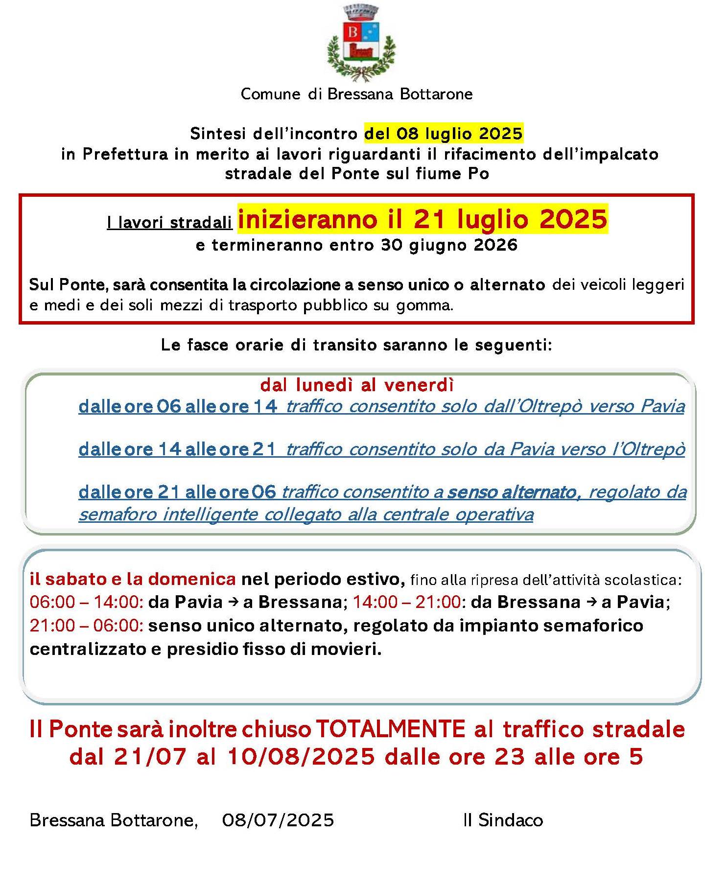 A partire da lunedì 21 luglio, inizieranno i lavori sull’impalcato stradale del ponte lungo la Strada Provinciale ex SS35 ("Ponte di Bressana"), con importanti modifiche alla viabilità per garantire sicurezza, fluidità del traffico e passaggi prioritari ai mezzi di emergenza.